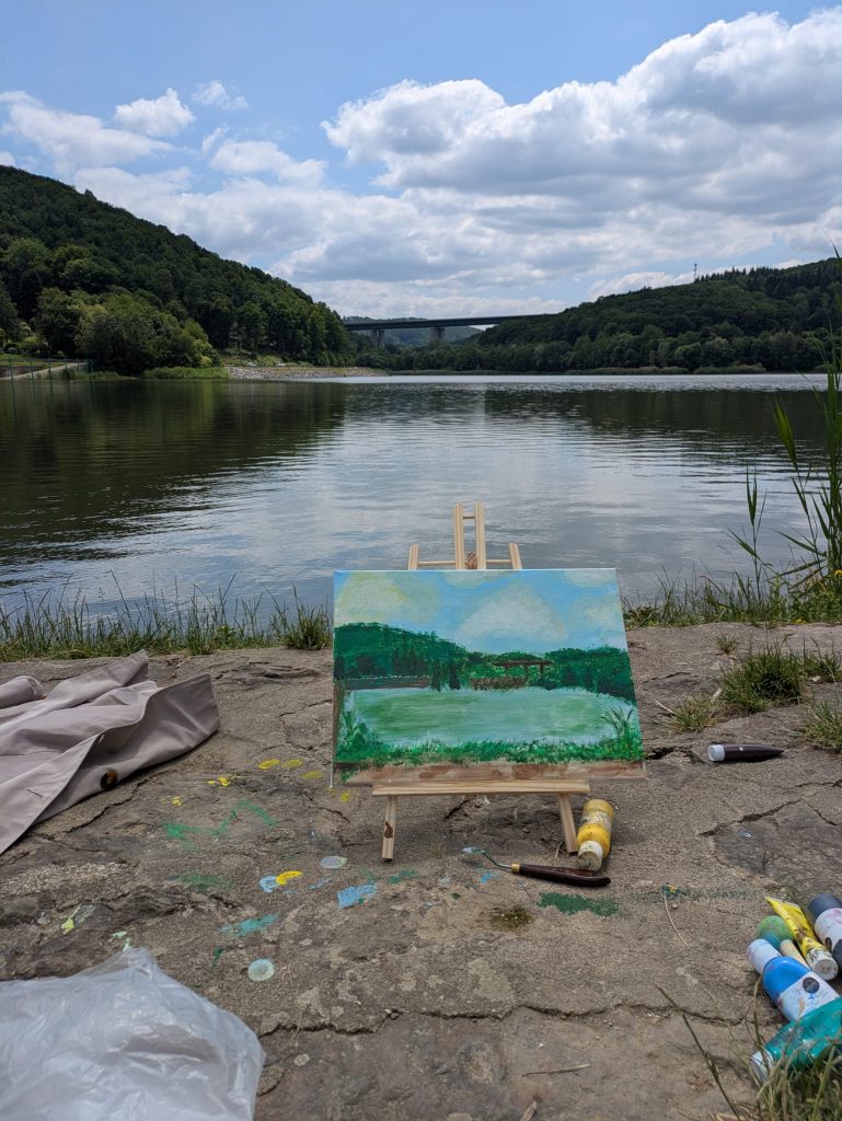 Am Montag, 16.06. und Dienstag, 17.06. hat sich die Oberstufengruppe „Bob Ross“ von Skizzen zur fertigen Leinwandzeichnung mit Acrylfarben vorgearbeitet.